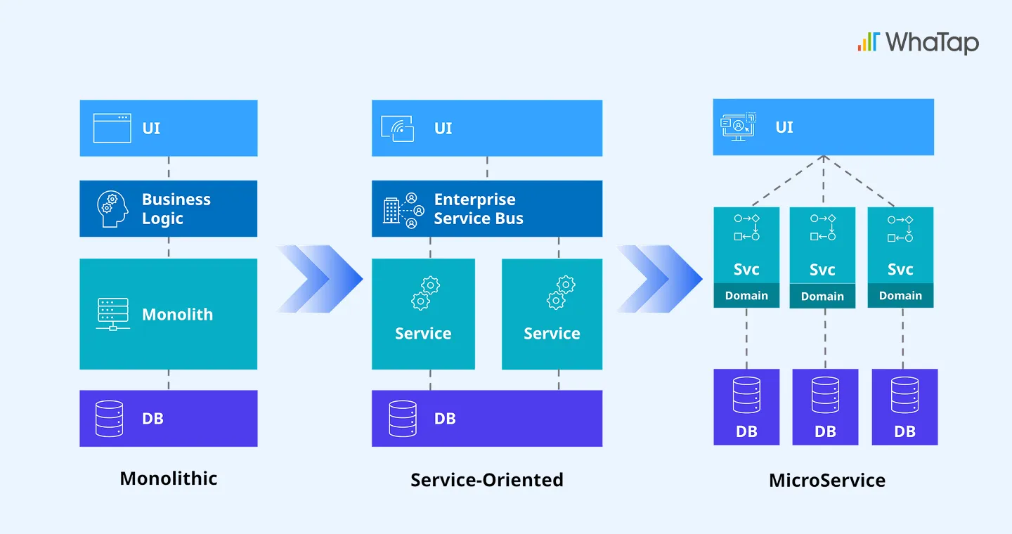 かつては、システムの構造がシンプルでした。複数のサービスが1つの統合DBを共有しており、障害が発生するとシステム全体にその影響が及びました。 そのため、運用の重点は統合DBがいかに安定稼働できるようにモニタリングするべきかにありました。従来の3階層アーキテクチャではWEB/WAS/DBが明確に分離されており、モニタリングもサーバー監視/APM(アプリケーション監視)/DPM(データベース監視)のようにサイロごとに分けて管理することが可能でした。 インフラ環境が静的だったからこそ、この手法が成り立っていたのです。