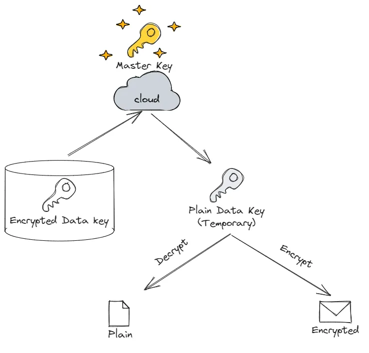 データキーとマスターキーを組み合わせたエンベロープ暗号化のプロセスを見てみましょう。