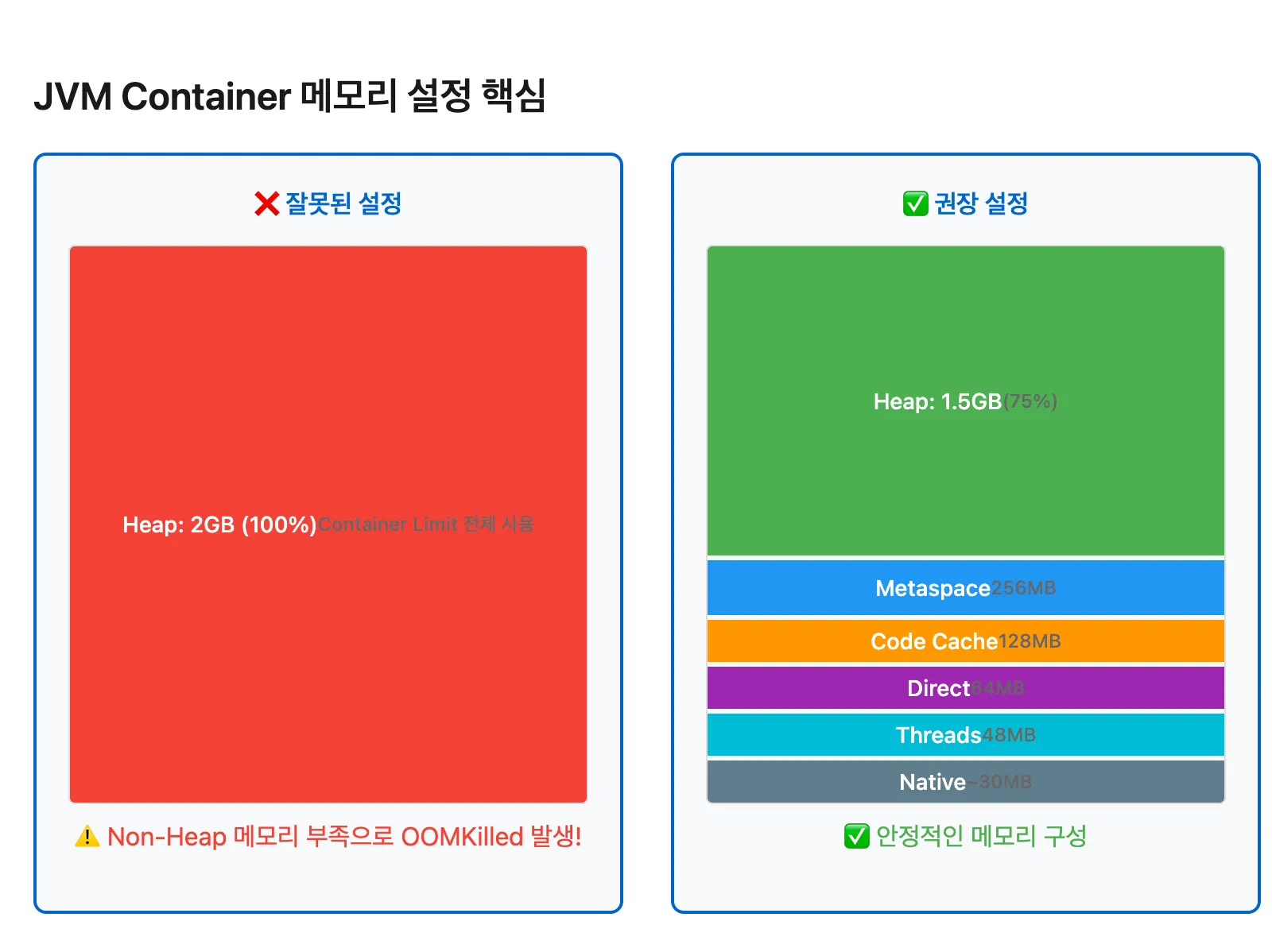 실제 운영 환경에서 검증된 설정 방법은 Container Limit의 70-75%만 Heap에 할당하는 것입니다. 나머지 25-30%는 Non-Heap 영역과 OS 오버헤드를 위해 예약됩니다.