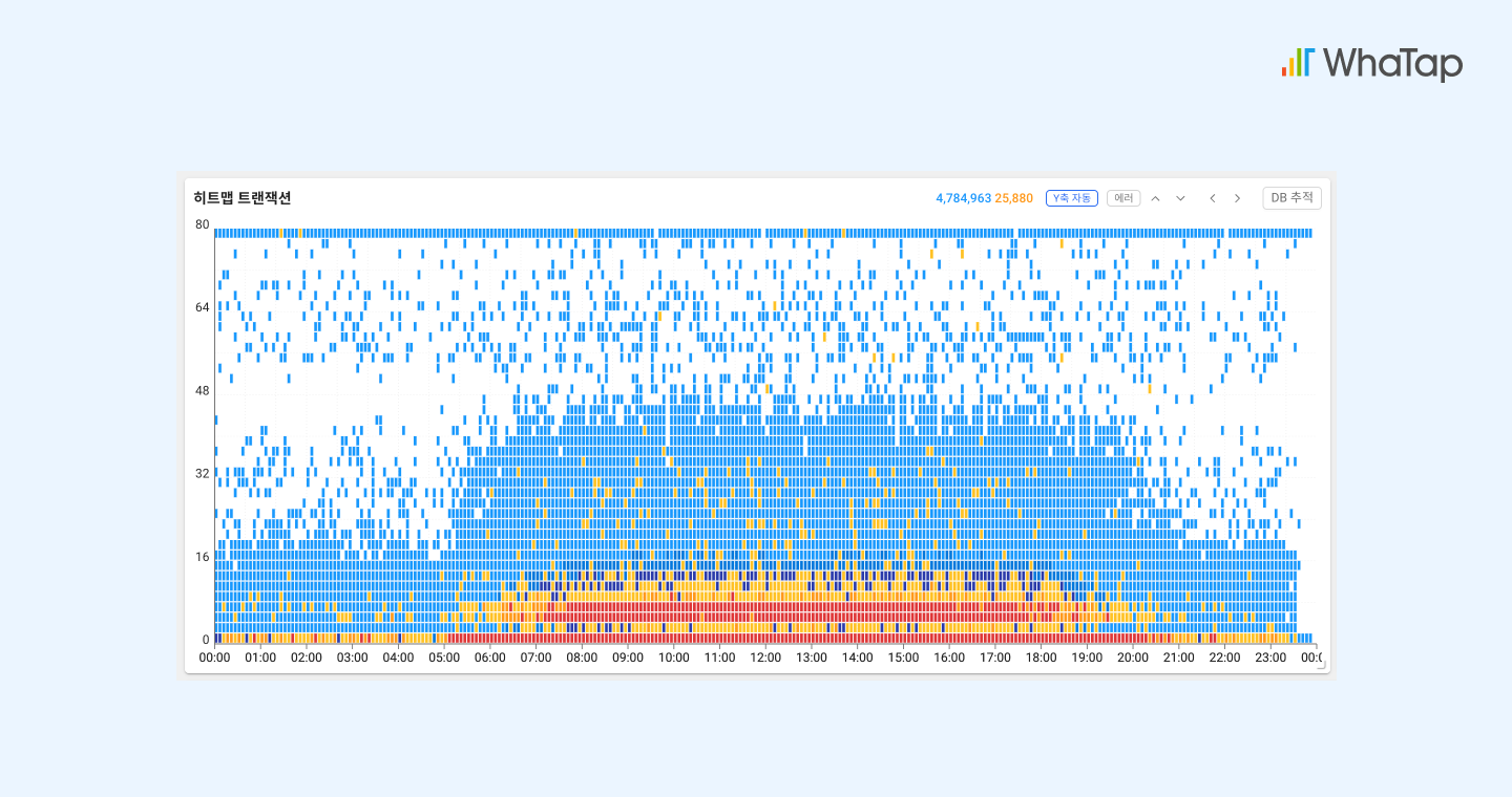 히트맵은 X축을 트랜잭션 종료 시점, Y축을 응답 시간으로 해서 종료된 개별 트랜잭션을 분포도로 표현한 차트다. 정상적인 웹 애플리케이션이라면 응답이 수 초 이하 구간에 집중된다.