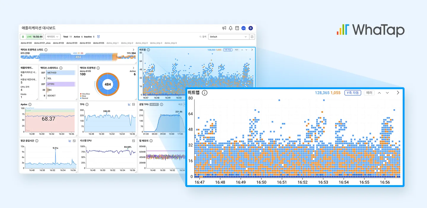 김민수: 저희가 연휴나 ‘무진장’ 같은 대형 이벤트 때는 트래픽이 폭발적으로 늘어나는데요. 그럴 때 와탭의 히트맵 차트를 보면 인증 API 호출이나 외부 부하 상황이 한눈에 보여요. 또 다양한 통계 지표를 활용해 평소와 비교하면서 어떤 구간에서 변화나 병목이 있는지 빠르게 확인할 수 있고요. 그래서 '무진장' 같은 기간에는 와탭 대시보드를 띄워놓고 계속 함께 모니터링하고 있어요.