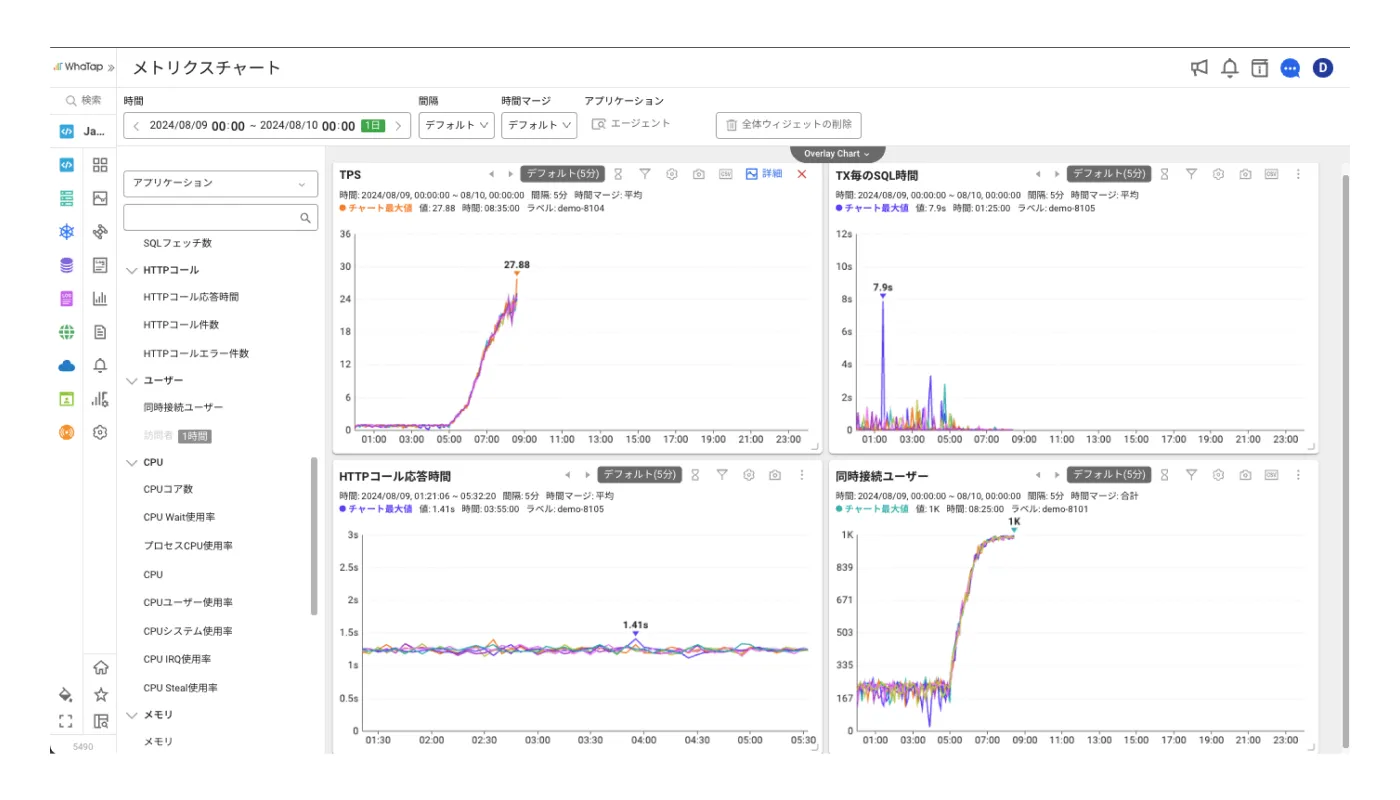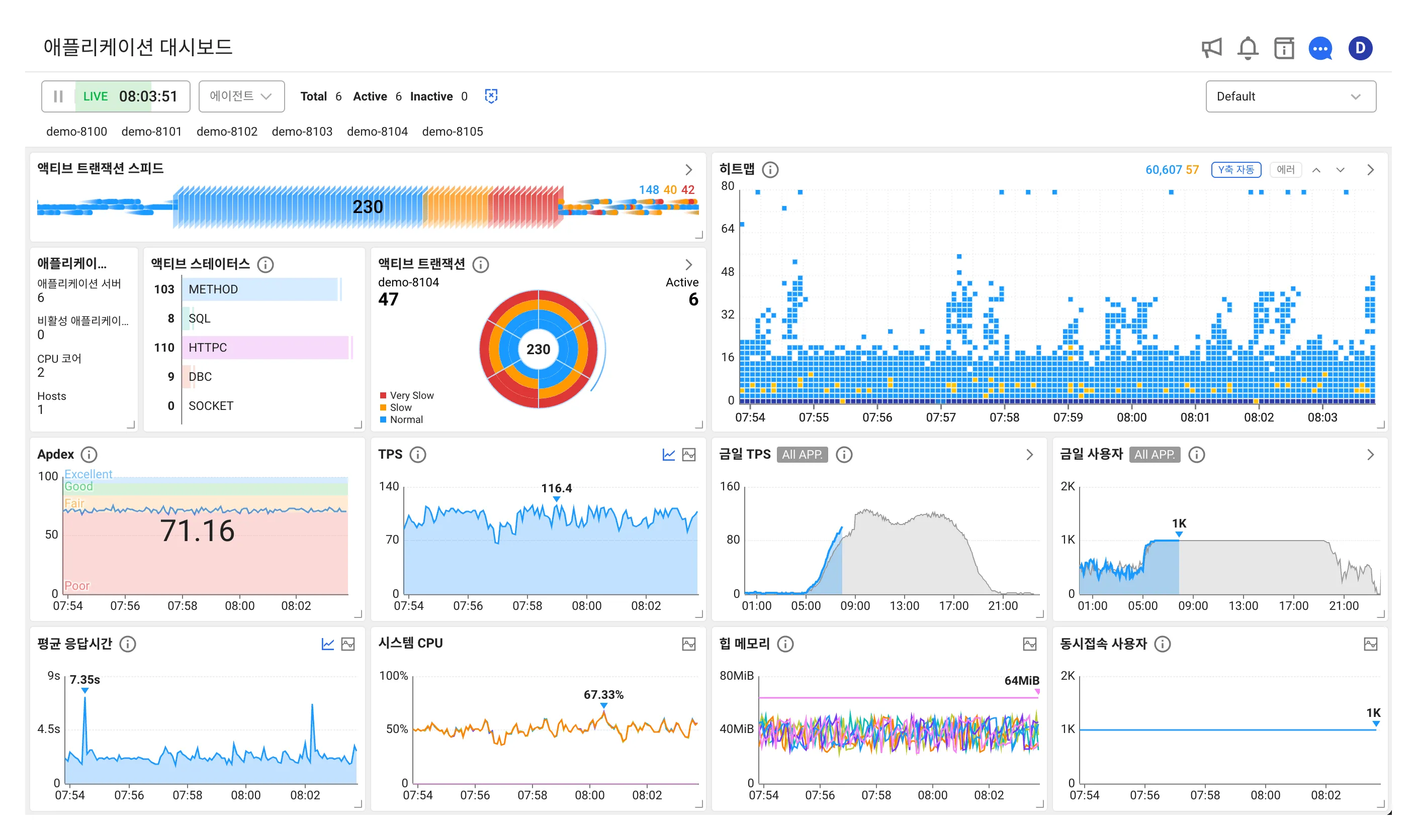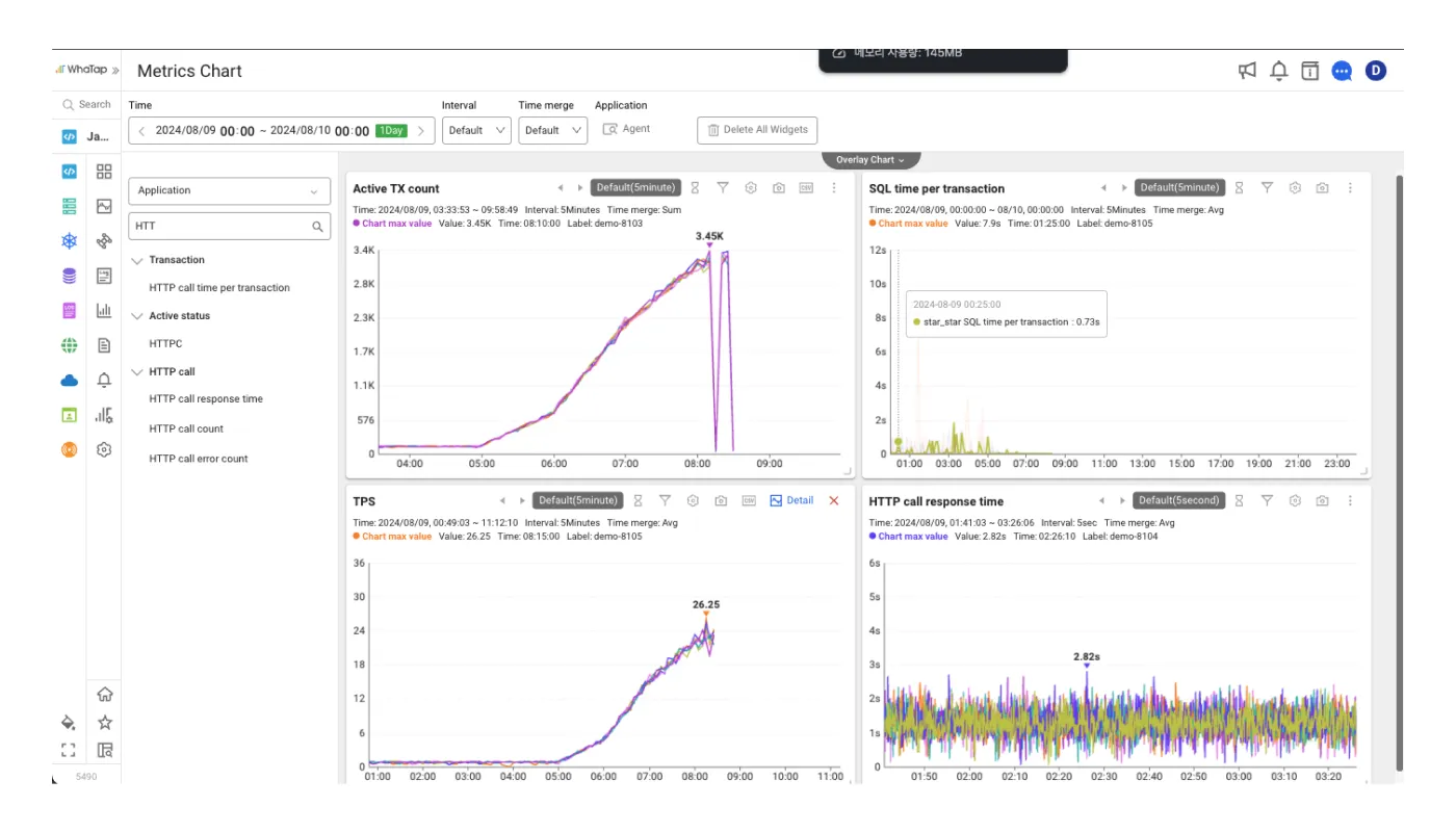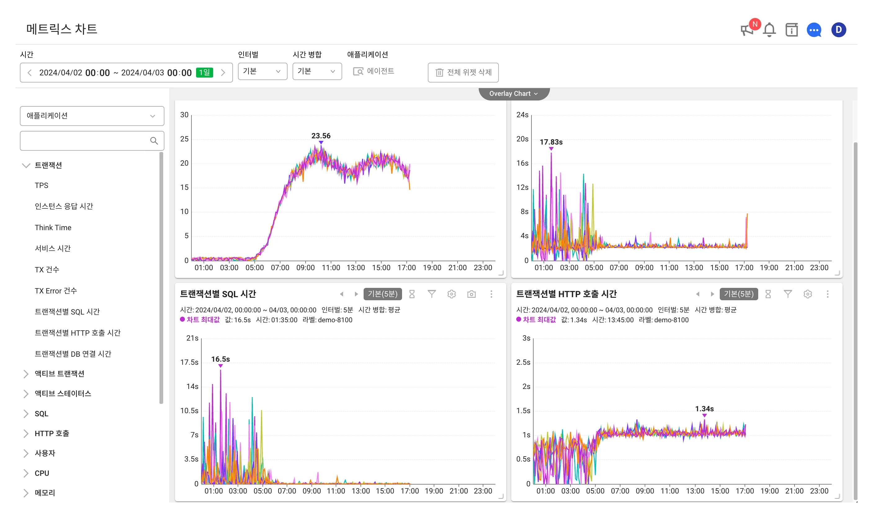 시간을 축으로 다양한 지표를 한번에 확인할 수 있습니다. 응답 시간, 에러 건수 및 처리량 등이 높은 시간대를 특정하여 확인할 수 있어 동 시간대 문제 요소를 식별하거나 서비스 현황을 정확하게 조망할 수 있습니다.