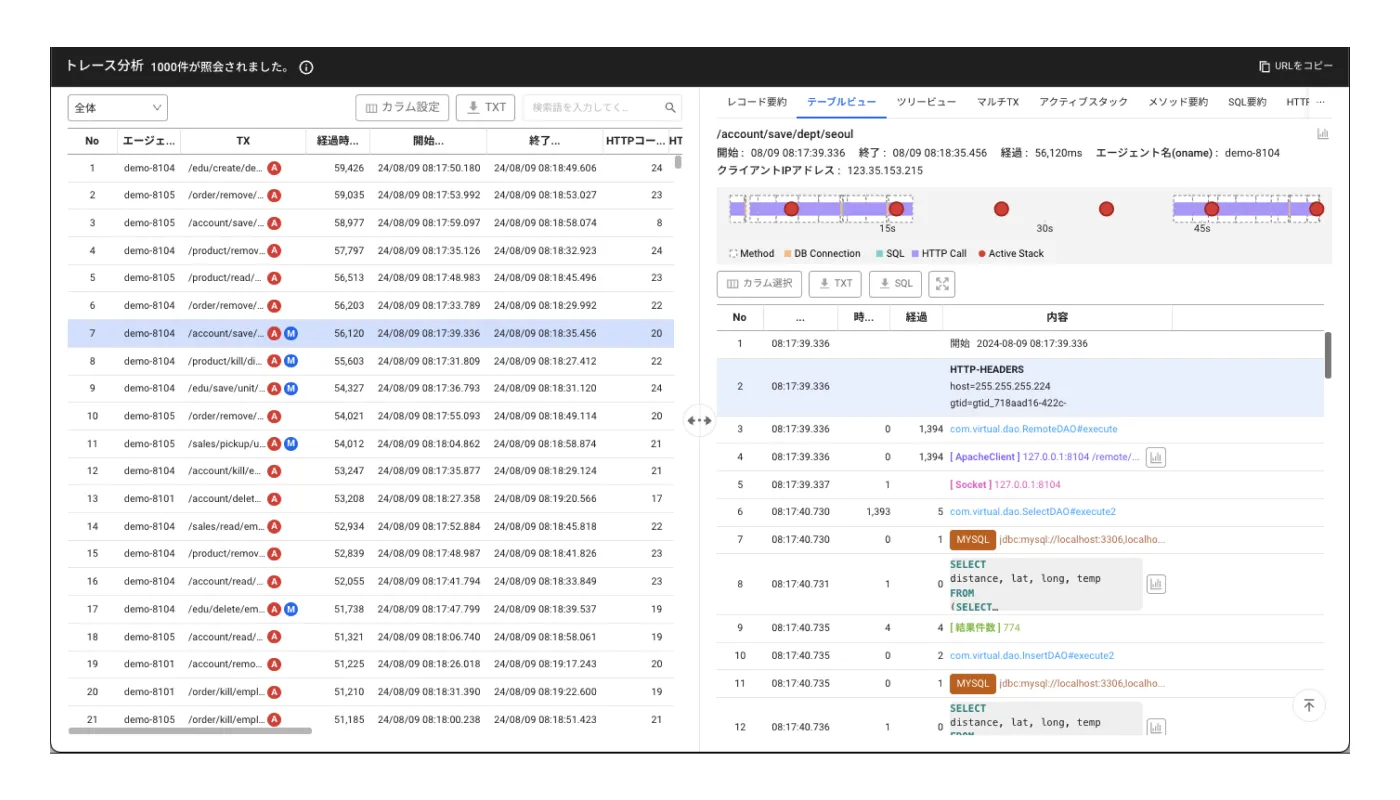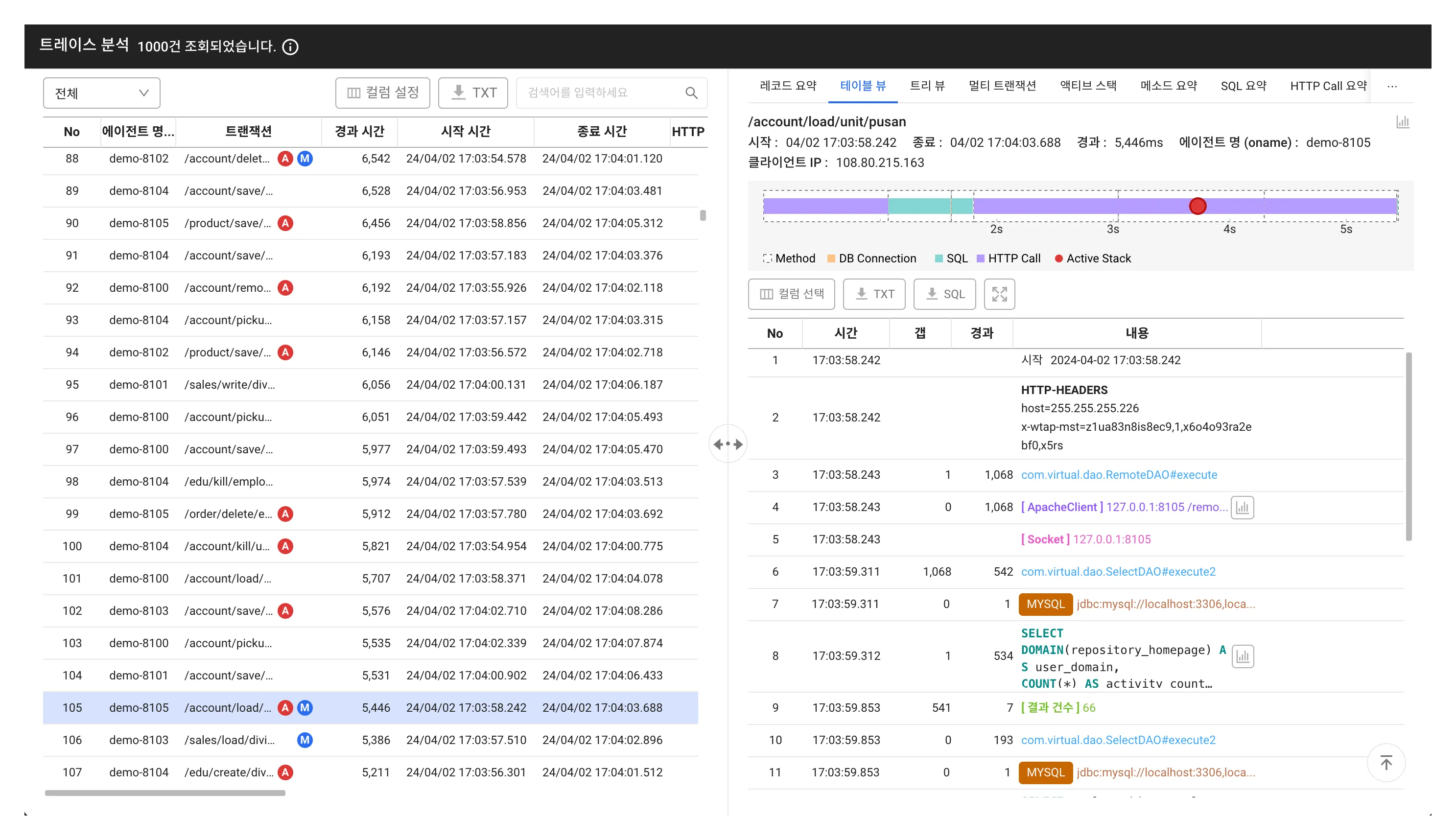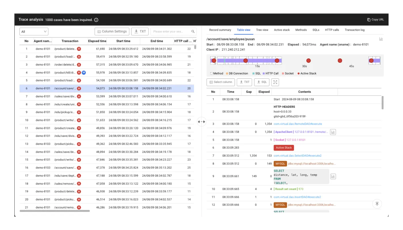 트랜잭션의 상세 프로파일과 트랜잭션이 수행되는 동안 남겨진 로그를 동시에 확인할 수 있어 더욱 쉽게 문제점을 파악할 수 있습니다.