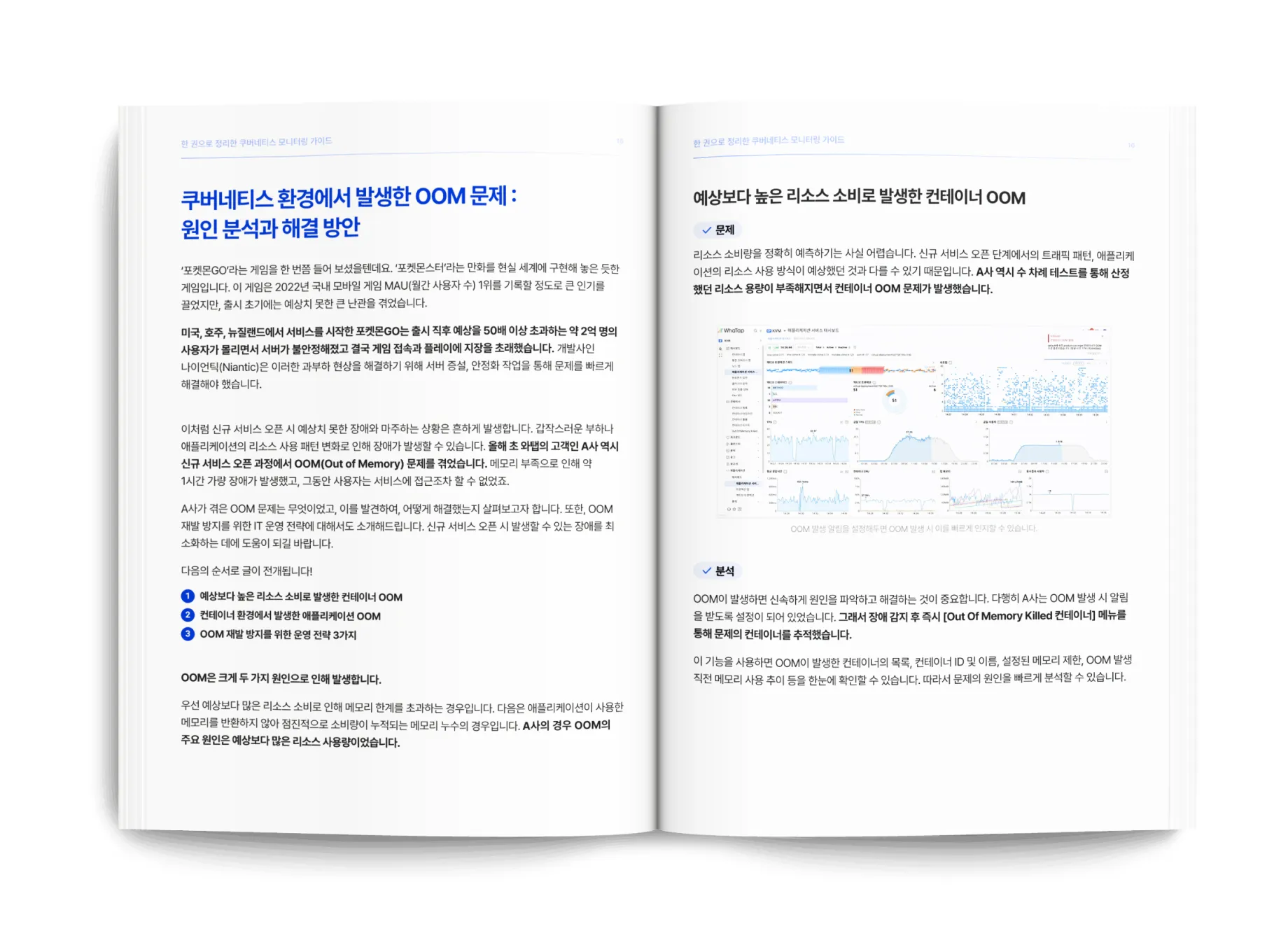특히, 끊임없이 변화하는 쿠버네티스 환경에서는 문제가 언제 어디서 발생할지 예측하기 어렵기 때문에 옵저버빌리티는 선택이 아닌 필수입니다. 이 eBook을 통해 실질적인 쿠버네티스 옵저버빌리티 인사이트를 확인해보세요.